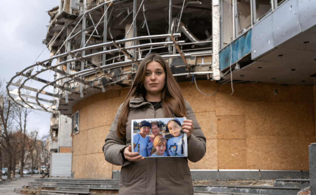 Marhartya holds a photo of her family together in Bakhmut in 2021. The city is now completely destroyed by the war.