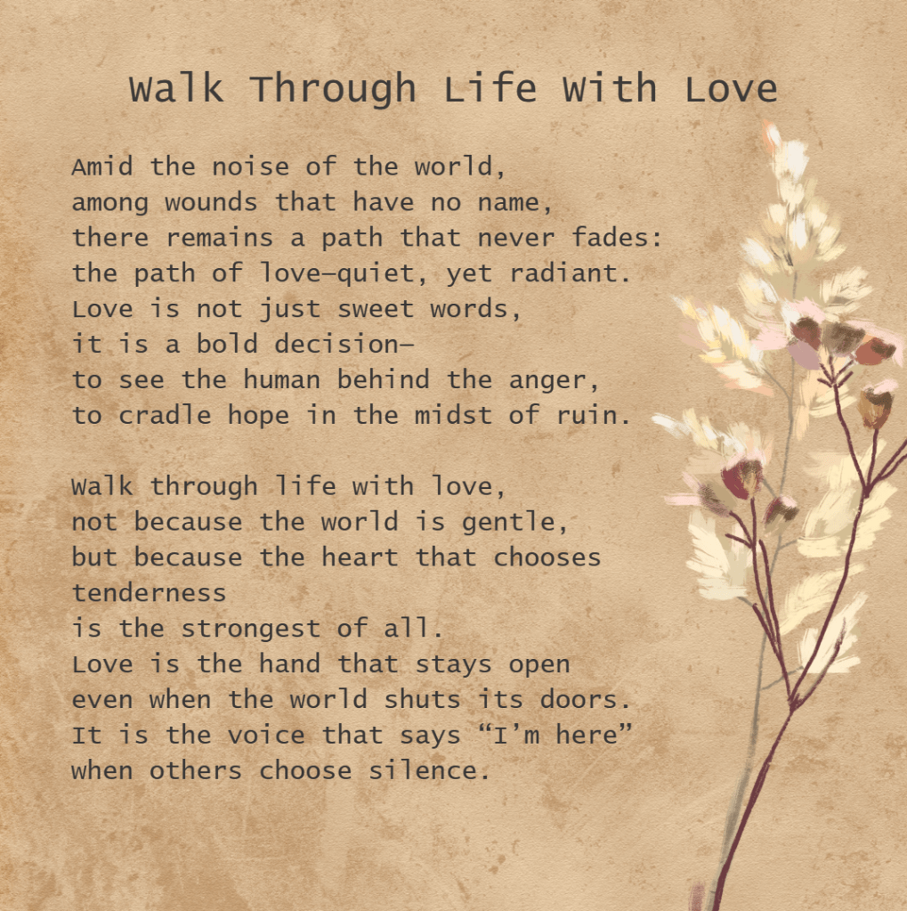 To walk through life with love is to remain human in a storm that wants us to forget. It is to resist the pull of indifference and choose connection instead. This path may be quiet, but it is powerful. It reminds us that dignity is borderless, that empathy is limitless, and that even in the darkest hour, love continues to shine—guiding us forward, one step at a time.