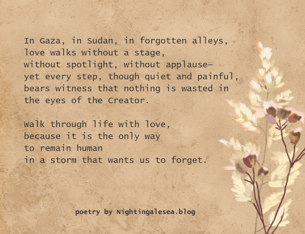 Love walks quietly. It does not seek a stage, a spotlight, or applause. In Gaza, in Sudan, in forgotten alleys, it moves without recognition—yet every step, though silent and painful, bears witness to a divine truth: nothing is wasted in the eyes of the Creator. Compassion offered in obscurity is still sacred. The open hand, the whispered “I’m here,” the choice to care when others turn away—these are the acts that heal the world, even when no one is watching.